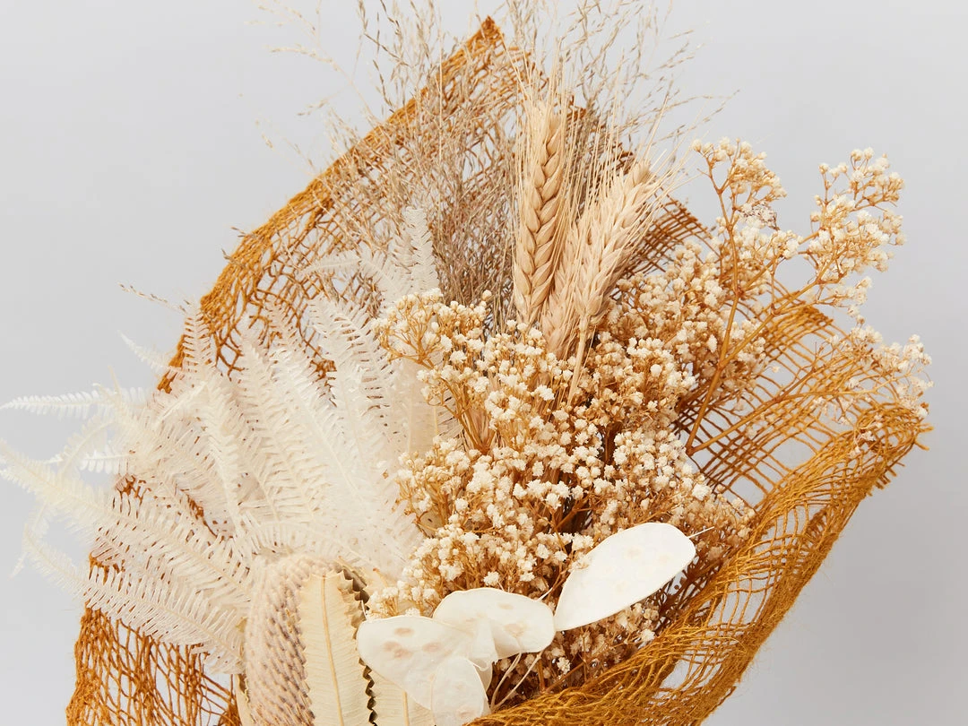 Dried flower posy (that’s florist speak for small bouquet), fully arranged and wrapped, ready to be gifted and to delight your recipient.