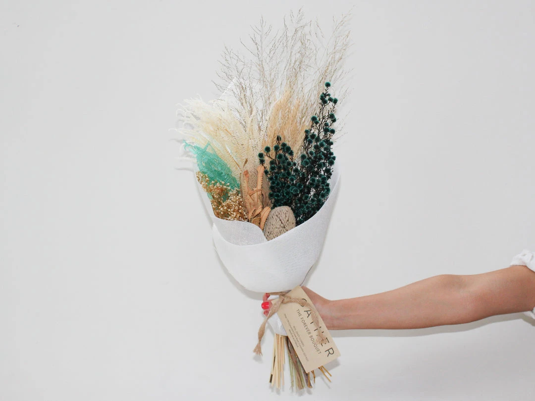 Dried flower posy (that’s florist speak for small bouquet), fully arranged and wrapped, ready to be gifted and to delight your recipient.