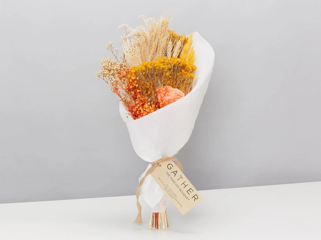 These everlasting blooms future burnt umber and mustard yellow tones with a preserved rose in warm peach. It’s not hard to tell where the name comes from right?