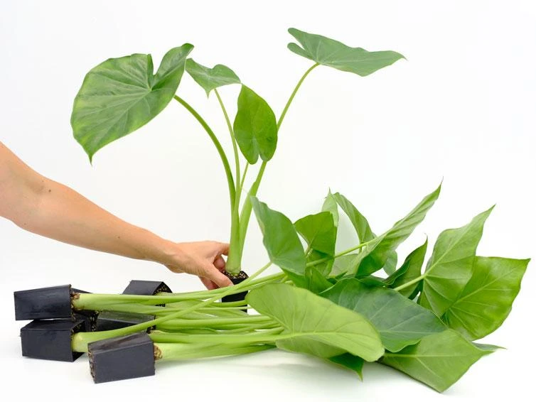 Alocasia macrorrhiza portadora is a particular beauty and a favourite with us, because it has fast-growing glossy emerald green leaves that can reach a metre in length. If you take care of this handsome plant it’ll make a ‘wow!’ feature for your home or tropical style garden.