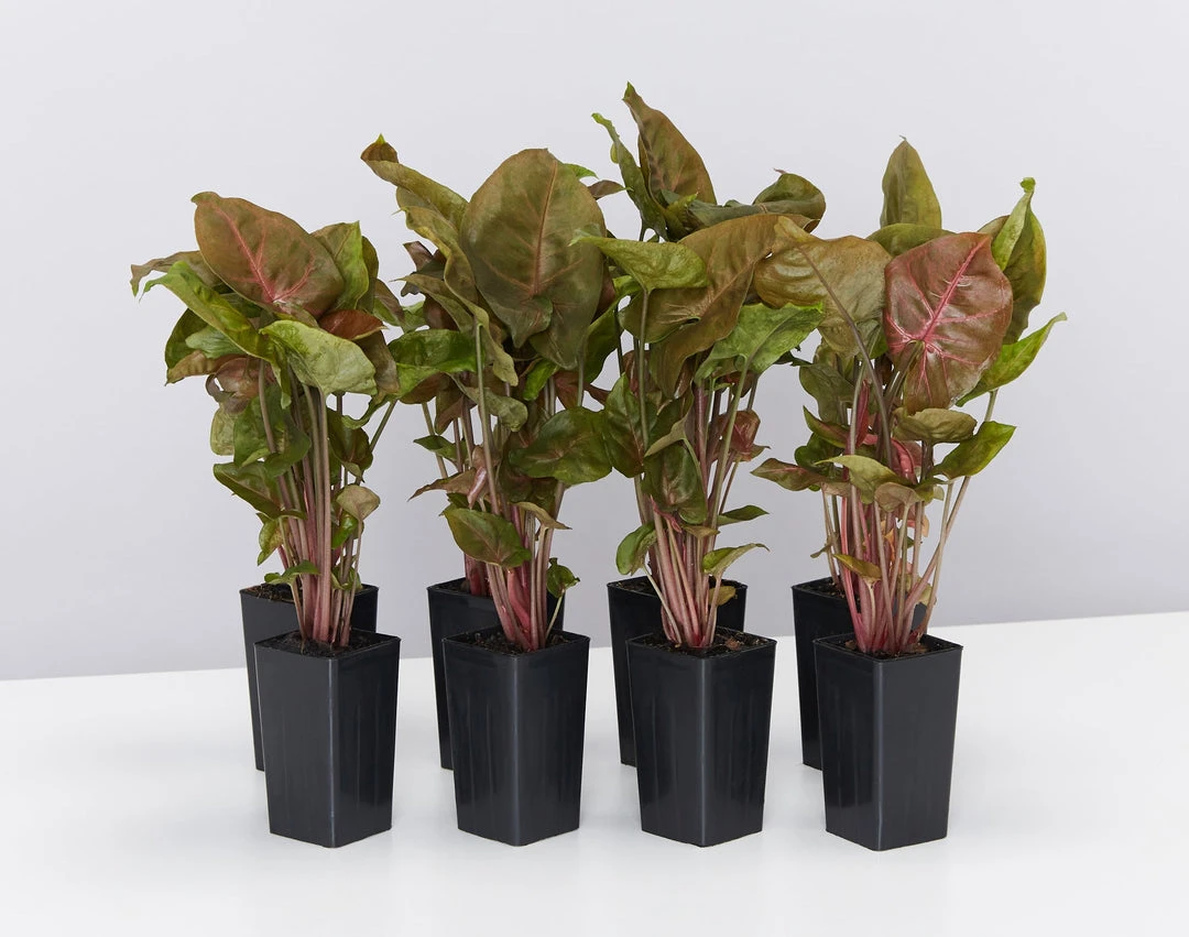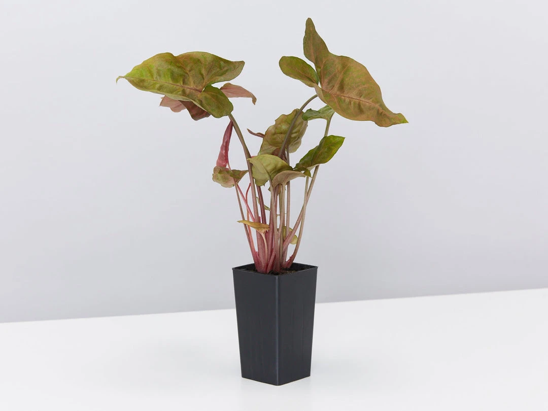 Syngonium podophyllum Bronze Maria is a natural evergreen beauty that shows off her traditionally arrow-shaped glossy leaves with bronze tones and red veins. She’s just a pleasure to own, especially when the new growth pushes through in baby pink.