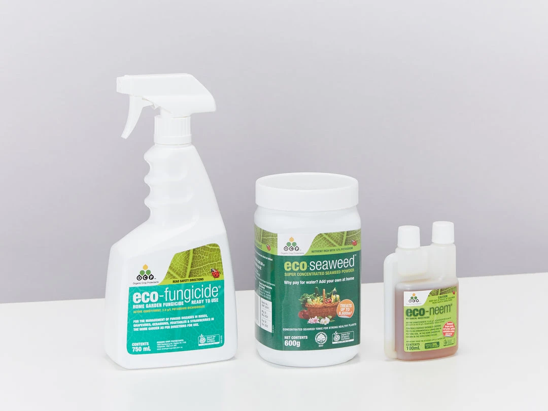 Get on top of your pest and disease problems without any nasty chemicals? This handy little bundle includes our three favourite organic care products which are all safe for you, your kids and pets. The pack includes Eco Seaweed, Eco Neem and Eco Fungicide.