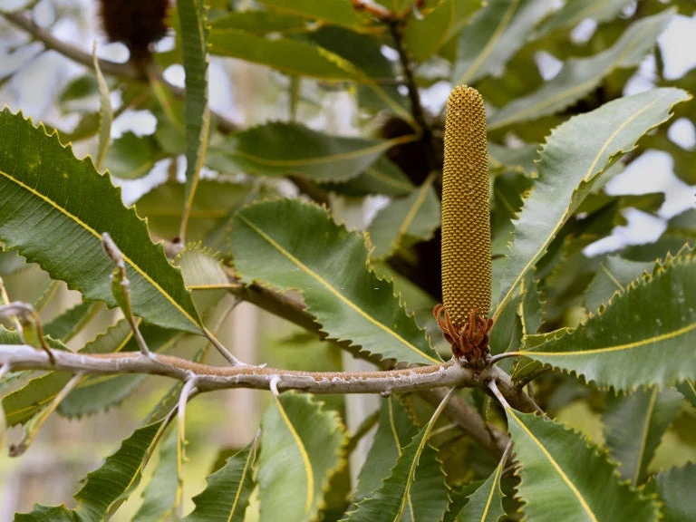 Banksia robur or Swamp Banksia is a fast-growing Native Australian Shrub and is super adaptable to most garden situations. This little guy is called the Swamp Banksia because it is naturally found in damper parts of the bush. In the garden, he will handle a damp, boggy spot but will also adapt to suit those drier conditions. The leaves of this beautiful shrub are large glossy green on top and light green underneath with serrated edges. Large blue/green flower spikes appear from January to July and turn to a golden yellow when mature. He’s a fast grower and will get to 1.5m tall in three years.Â