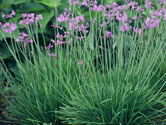 Tulbaghia violacea is also known as Society Garlic and is the perfect border plant for any garden. This hardy little plant has grey/green foliage that looks like chives with dainty purple flowers. Plant me on mass and I make a big impact with my purple flowers.