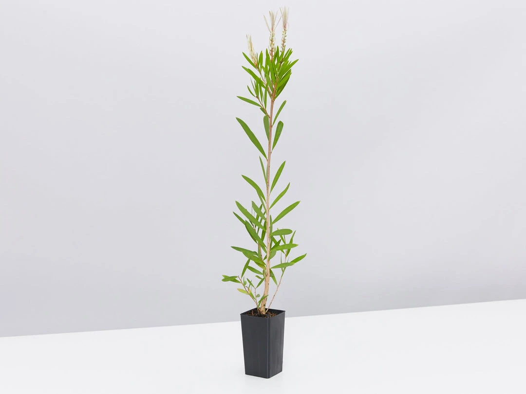 Callistemon citrinus ‘Pink Champagne’ is a larger Callistemon shrub with pink bottlebrush flowers and yellow pollen in spring and autumn. The flowers will fade to white as they age, and are complemented perfectly by grey-green foliage.