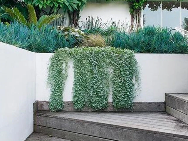 I am the only live plant you will need if you’re thinking “god I need to cover that ugly retaining wall.” He is easy to grow, can handle frost, has minimal water once established and does well by the beach. Dichondra Silver Falls can flaunt amazing grey/silver fan-shaped leaves basically – looks great cascading.