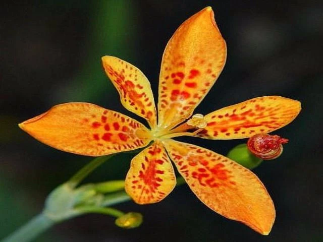 Iris domestica or ‘Leopard Lily’ also known as the Blackberry Lily, is actually part of the Iris family and not a true lily. The striking foliage as flattened fans of sword-shaped, iris-like, light blue-green coloured leaves with deep orange flowers, heavily spotted with red dots (hence the name ‘Leopard Lily’). Flowers appear in early, to mid Summer. They will tolerate light shade, but flower better in full sun. Providing contrasting foliage and growth habit, plus a spectacular display of flowers, maximise the impact of Belamcanda chinensis, by mass planting in your garden.Â