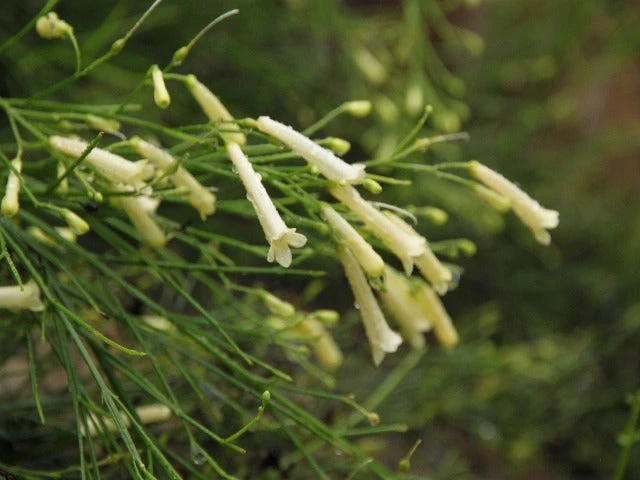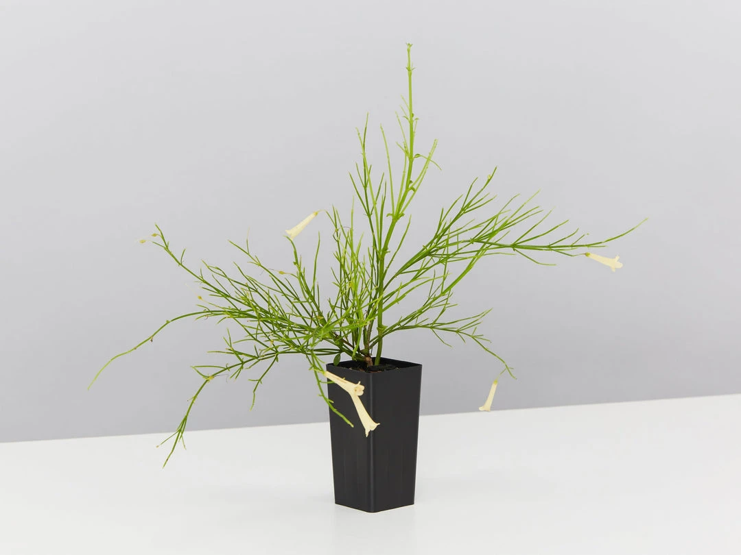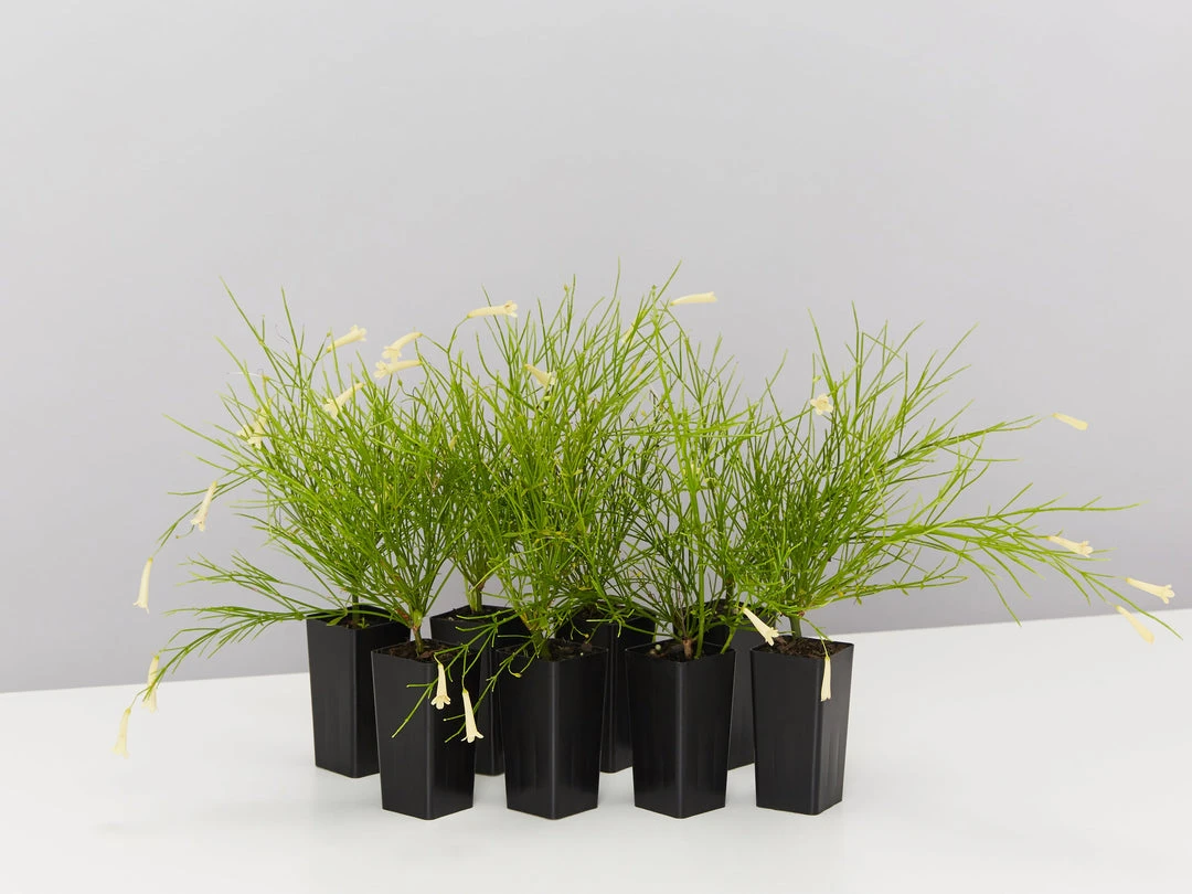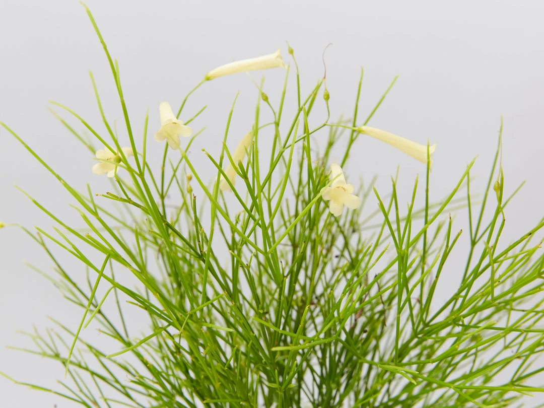 Russelia equisetiformis ‘Lemon Falls’ is a small, evergreen shrub. Lemon Falls is grown for its showy, pendant clusters of tubular flowers which appear from Spring to late Autumn. She prefers a warm, sunny position in light, well drained soil. Its pendulous habit makes it ideal for hanging baskets and decorative tubs. It also looks amazing spilling over a wall.