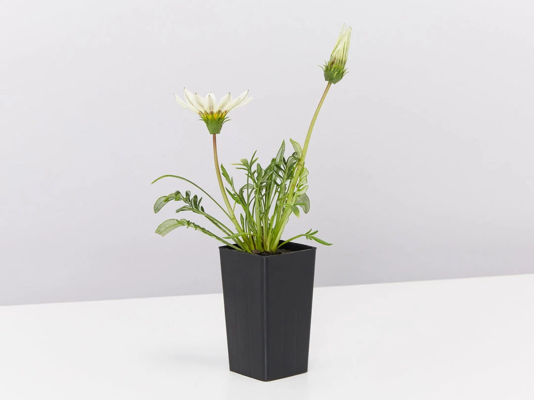 Gazania rigens New Day White is the cutest little flowering, groundcover who will need virtually no maintenance to look the part yet provides masses of white coloured flowers for most of the year. The New Day White has beautiful white petals with a red/brown circle meeting together at a bright yellow centre.Â