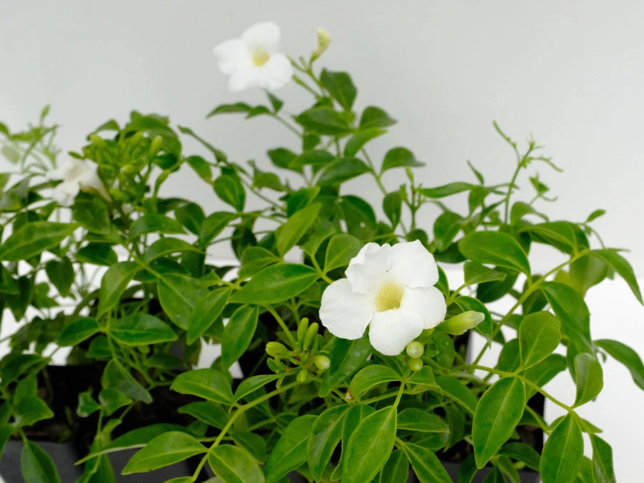 If you love large white flowers, you’ll go crazy for her lightly-scented white trumpet blooms that stand out against her deep green foliage. Expect to see these repeat flowering from summer to autumn in masses.