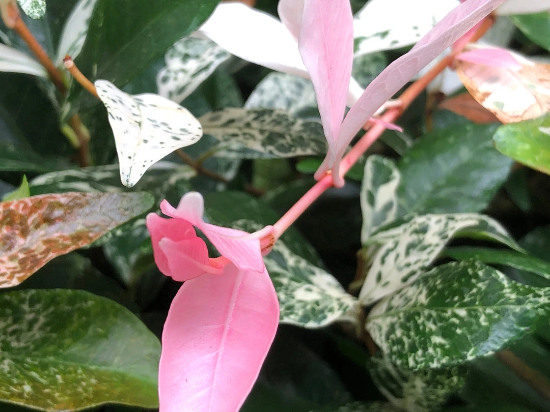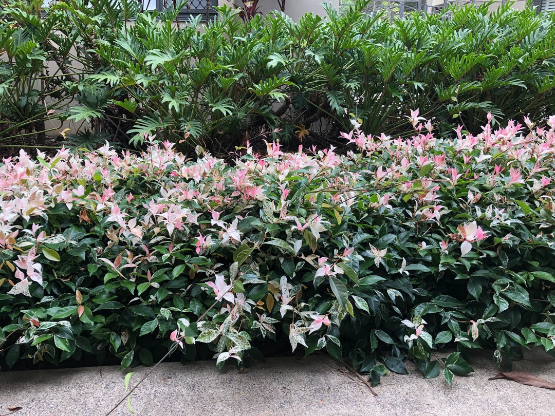 Trachelospermum jasminoides variegated “Star Jasmine”, also known as Jasmine tricolour. This plant has a beautiful mixture of leaf colours ranging from green to pink and white. You can hedge it, cover a wall with it, use as a ground cover, let it ramble down an embankment. Super versatile, is hardy, has a beautiful scented white star-like flowers. What more could you want?