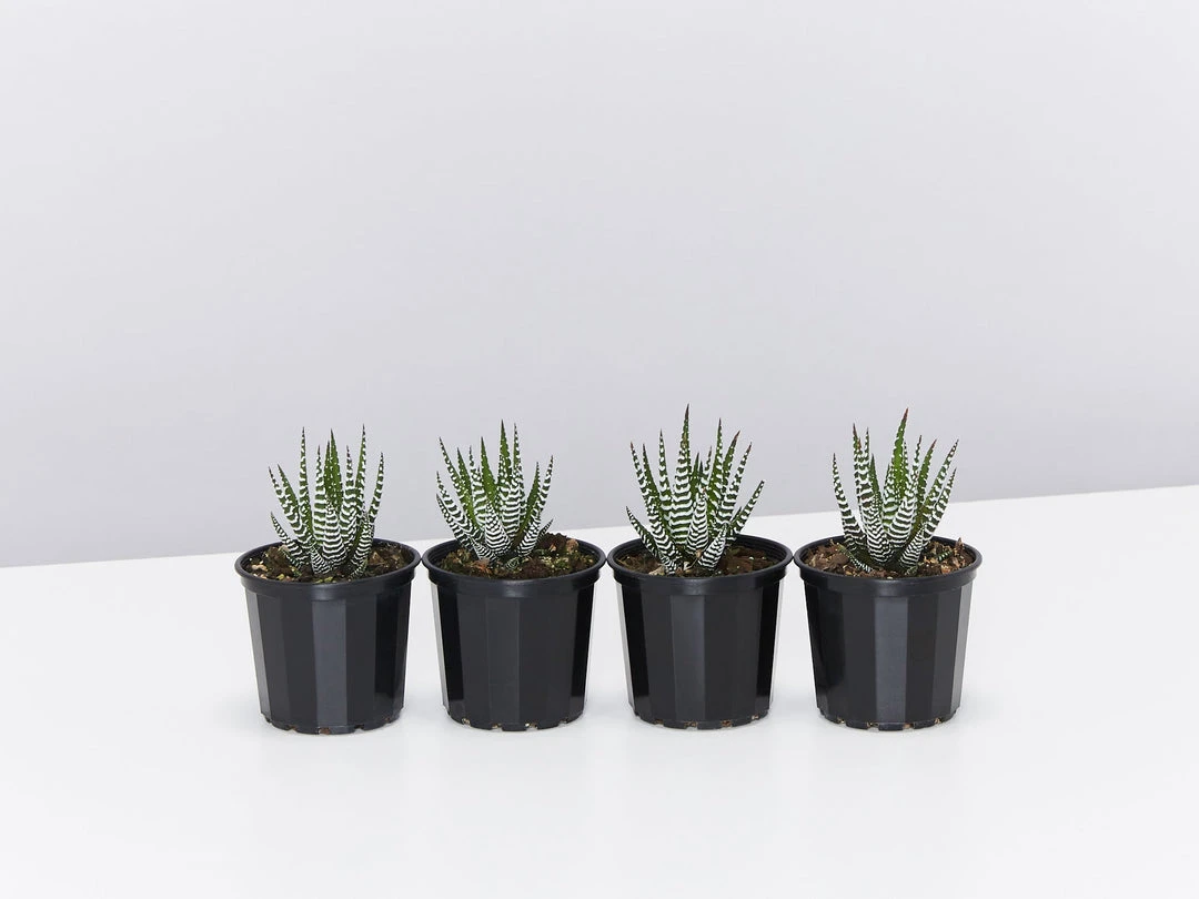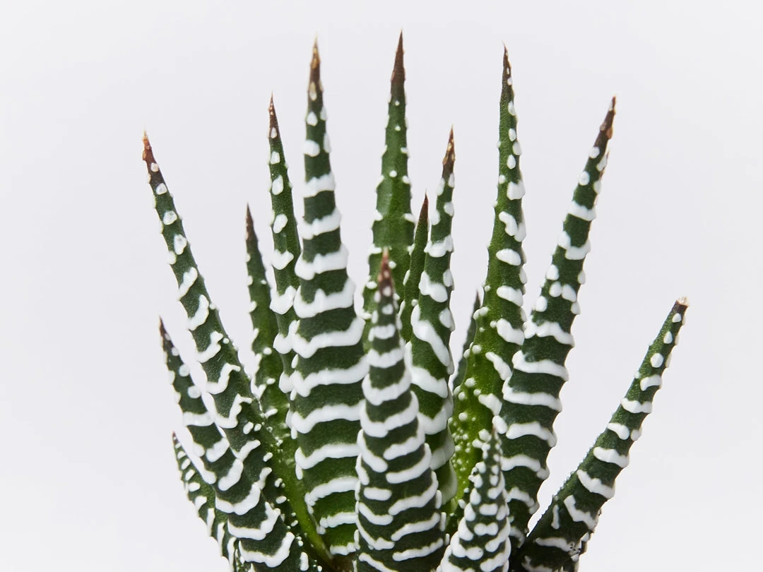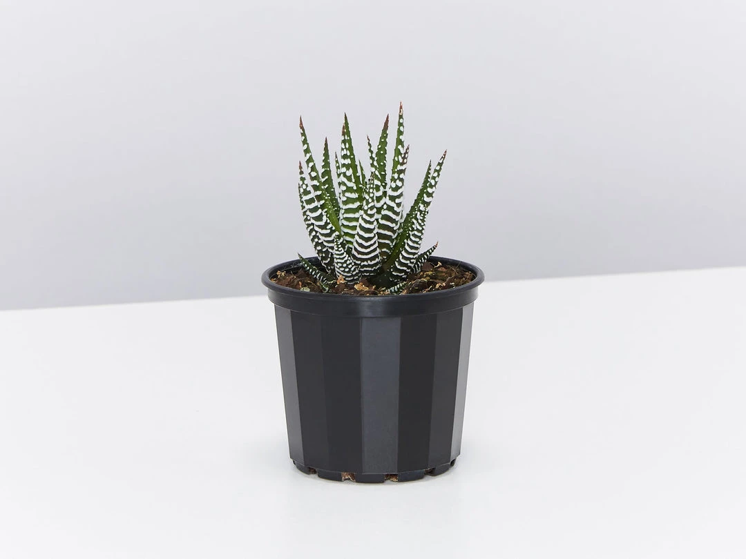 Haworthia fasciata Wide Band is an upright succulent with dark green spike shaped leaves that form in a tight rosette. The star of this succulent is the patterns – raised white dots and stripes appearing on each leave that stand out against the dark green.Â